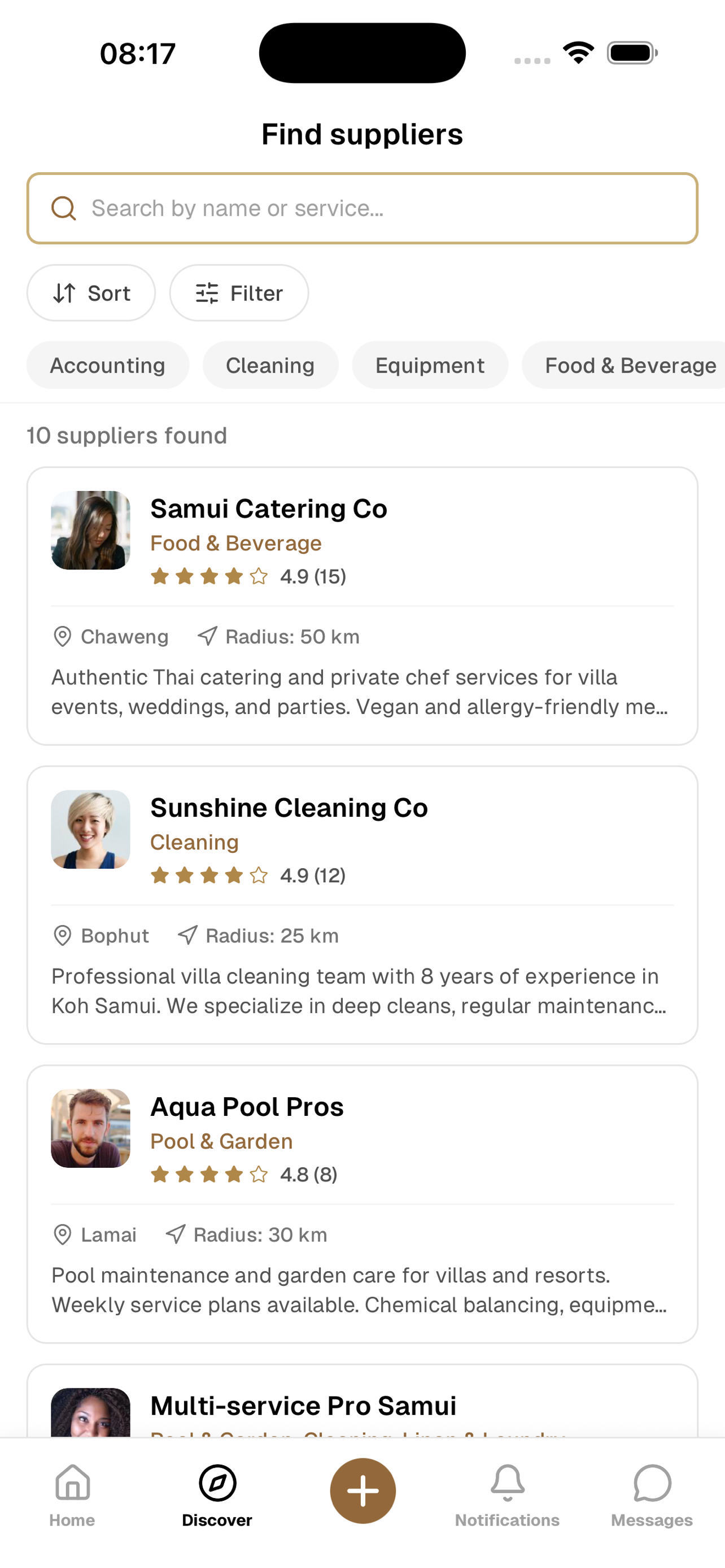 Discover trusted local suppliers across 12 service categories, message them directly and manage your hospitality business — all from one app.